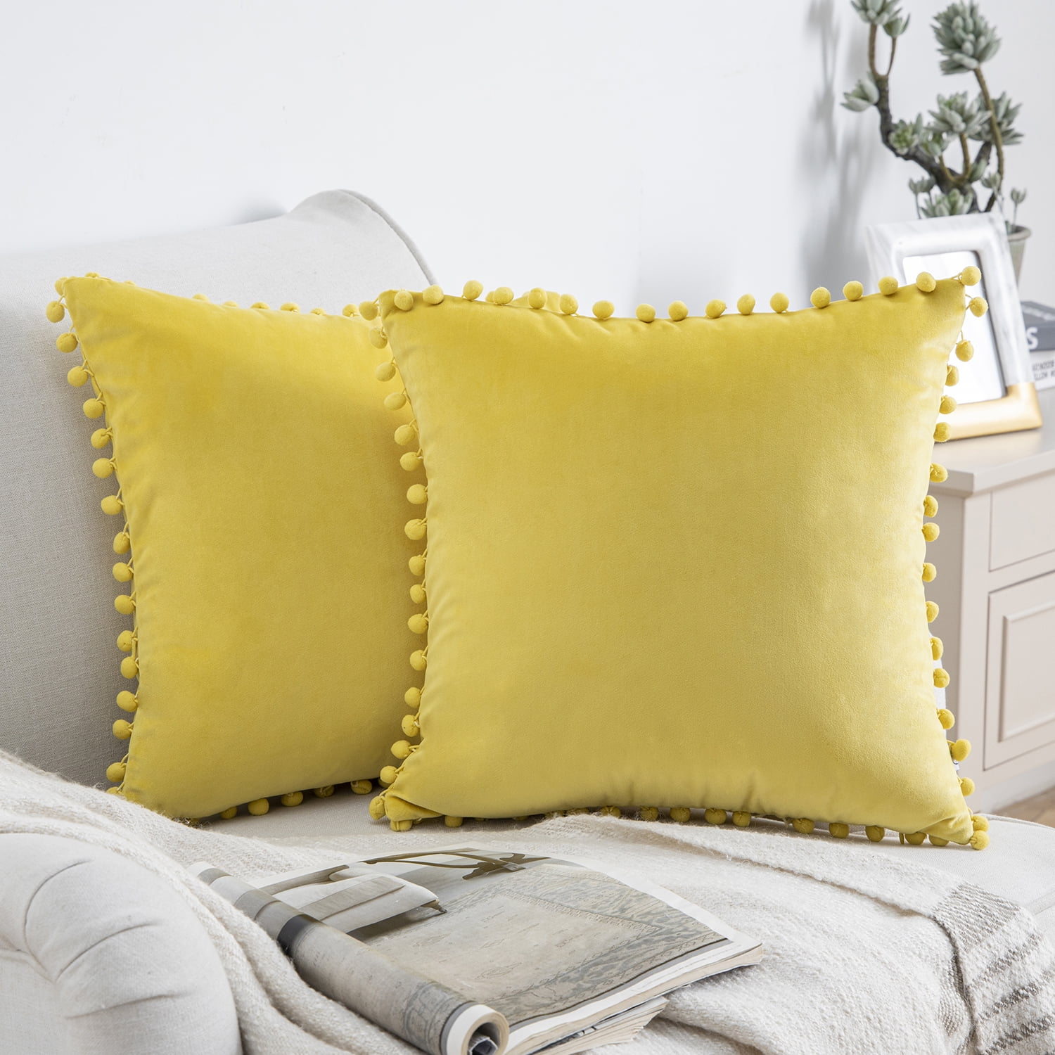 Phantoscope Silky Velvet Series Pom Pom Decorative Throw Throw Pillow Covers Cushions For Sofa Couch 22 X 22 Yellow 2 Pack Walmart Com